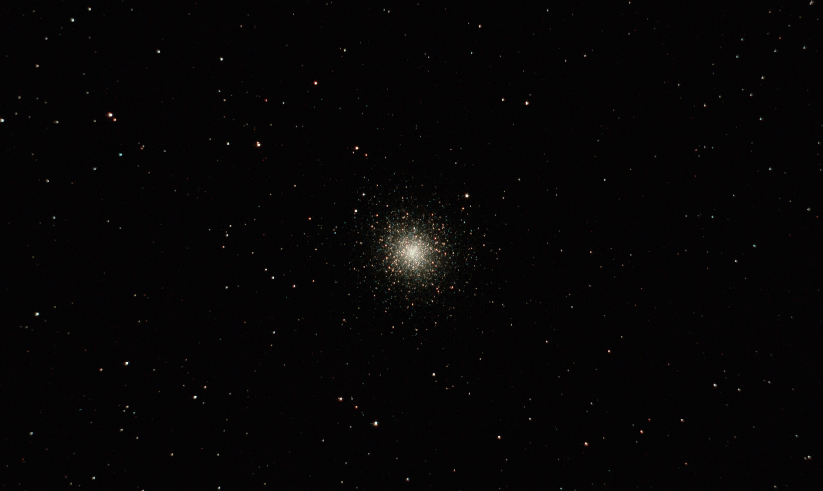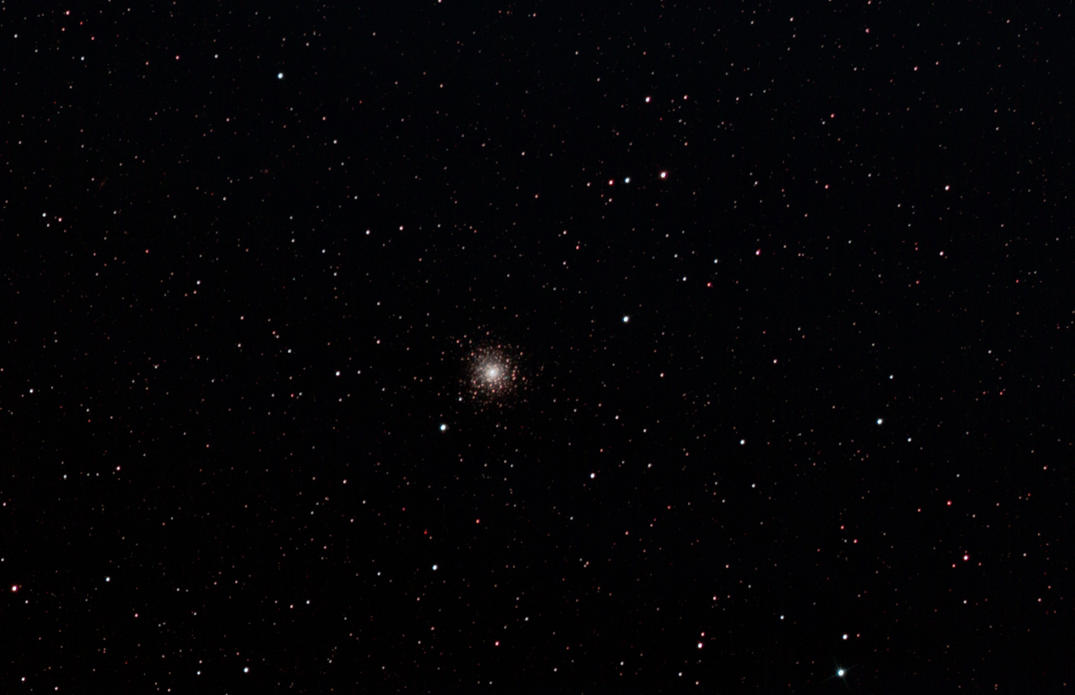 am 1.5.2017 Komposit aus 35 Einzelbildern je 110s; Canon EOS 1100Da mit CLS-Filter, belichtet im Primärfokus des 250/1016 SN Sternbild Schlangenträger 11' 7,6m 30 000 ly Kugelsternhaufen (Windböen erzeugten deutliche Unschärfen in jedem Bild) |