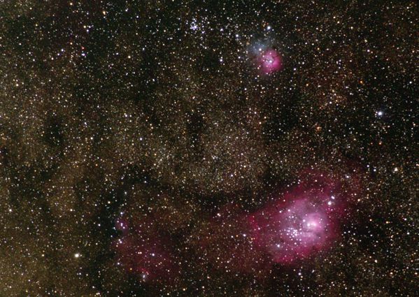 In diesem Bild nahm ich M 8 und M 20 im Sternbild Schütze als Ziel. Später stellte ich fest, dass ja auch M 21 mit drauf ist. M 21 ist ein offener Sternhaufen in einer Entfernung von etwas mehr als 4000 ly. M 20 wird auch als Trifidnebel bezeichnet und ist über 5000 ly entfernt. Mehr Informatinen zu M8, dem Lagunennebel gibt es hier. Im ganzen Bild sind im Hintergrund die Sternenwolken der Milchstraße sichtbar. Die hier aufgenommenen Objekte befinden sich visuell recht nahe dem Milchstraßenzentrum.