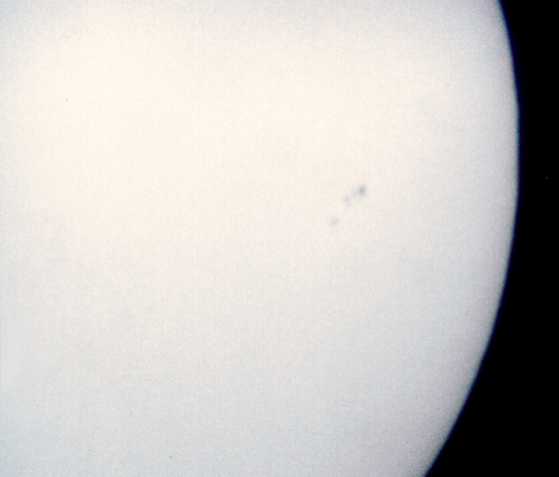 Zu meinen ersten Aufnahmen mit der ToUCam Pro II gehört das folgende Bild eines kleinen Sonnenflecks am Sonnenrand. Alle visuell sichtbaren Details sind auch in der Aufnahme zu erkennen. Der Vorteil von Aufnahmen mit der Webcam ist, dass man das Ergebnis direkt auf dem Monitor kontrollieren und Werte für Belichtungszeit, Helligkeit, Kontrast und Gamma entsprechend anpassen kann. Eine Okularprojektion scheint bei dieser Methode nicht notwendig zu sein. Der Aufnahmechip der Kamera ist sehr klein. Darauf wird nur ein winziger Teil des Bildfeldes abgebildet. Auf diesem Bild ist die Sonne deshalb so groß zu sehen wie auf einem normalen Foto bei etwa 10 m Brennweite. |